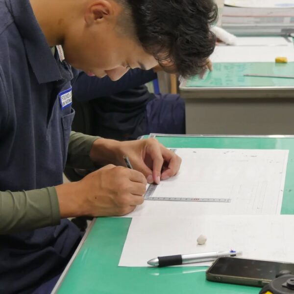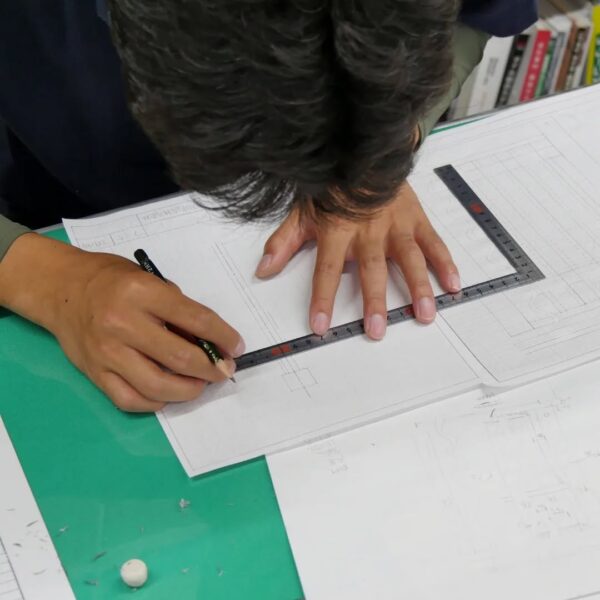 テーマは、自社物件プロジェクトにおける施工図。実際に施工に関わる立場から、その必要性や役割を理解するため、自ら図面を描き、施工を体験しながら学んでいきます。